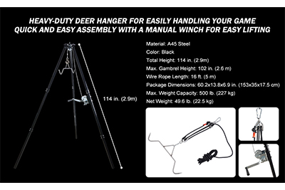 Take your deer processing capabilities to the next level with the Deer Game Hanger Hoist. With its versatile functionality, durable construction, and essential features, this Meat Hanger for Deer is a game-changer for hunters and processors alike. Order now and elevate your deer processing game with the ultimate tool for hanging, skinning, and drying.
